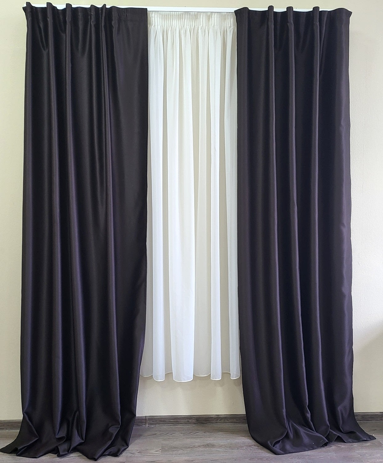 Комплект штор портьерных , блэкаут на шторной ленте . Ширина каждого полотна 140 см. Пин-ап темно-коричневый ( темный шоколад) . 100 % ПЭС . Вид рисунка однотонный . Рекомендации по уходу сухая чистка . Отлично драпируются . Рекомендуемая ширина карниза 150 см. Затемнение от солнца и дневного света 60-70% . Материал производство Турция.